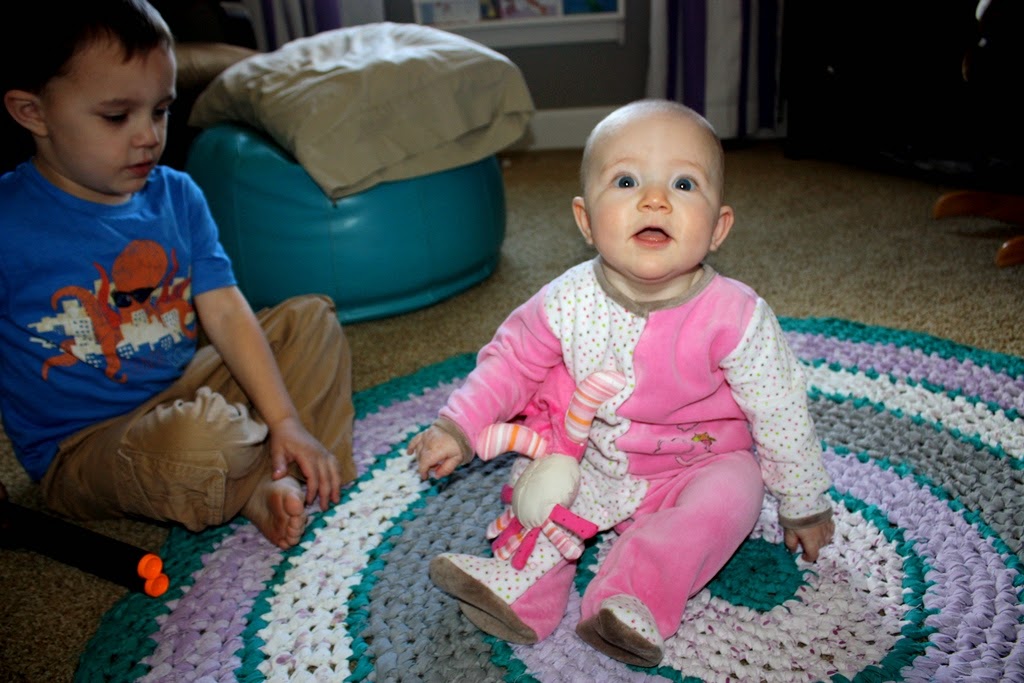 And knock on wood, but at the moment we're doing better at night. She's only waking once to eat. She's a good little napper taking 2-3 naps a day, she talks all the time, squeals with delight, sits up and plays with her toys, loves to be held, loves all things solids (so far she's had carrots, squash, sweet potatoes, peas & peaches), lights up when kids interact with her, is fascinated with Clyde & Suzie, tries to put everything in her month and is still a puker,